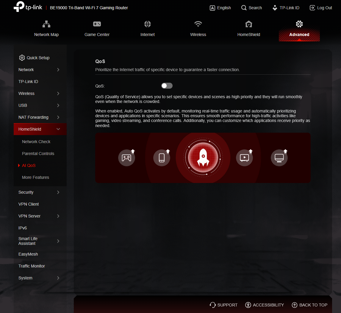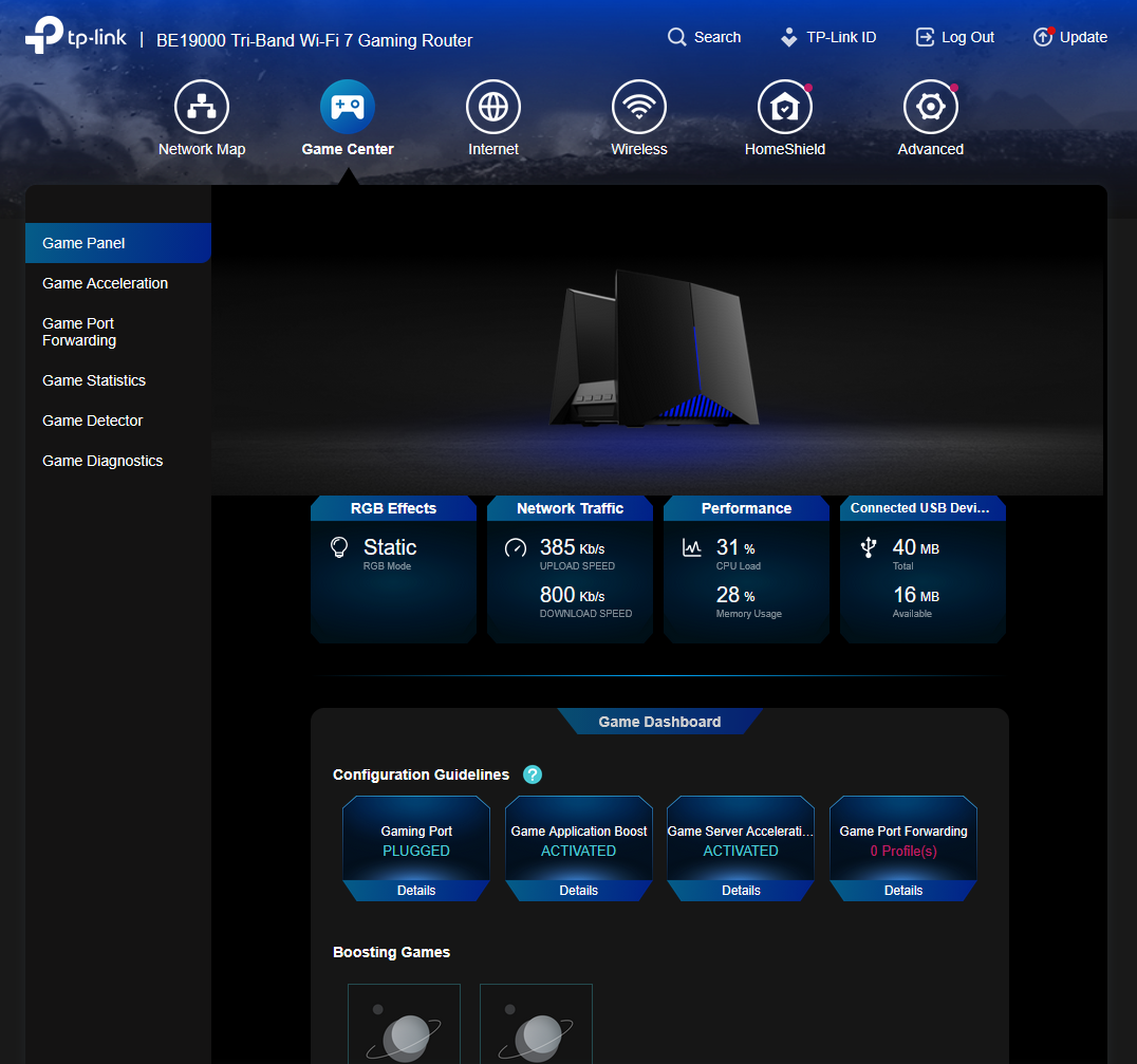 Als je de webinterface opent, is het onmiskenbaar dat je hier met een gamerouter te maken hebt. De vormgeving is technisch en futuristisch met Ferrari-rood als accentkleur. De tweede snelmenuoptie is het gamecenter, waar je alle optimalisatiefuncties kunt bedienen en monitoren.