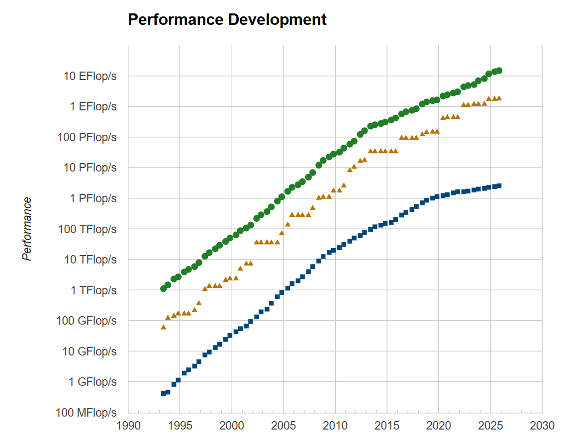 Cirkels: som van TOP500-lijst; driehoeken: nummers 1; vierkantjes: nummers 500. Bron: TOP500