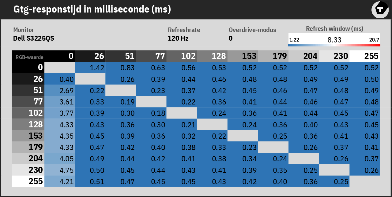 Met ingang van dit jaar meten we de reactietijden van het scherm met behulp van een oscilloscoop van PicoScope, aangesloten op een sensor van Thorlabs. Via zelfontwikkelde software kunnen we geautomatiseerd metingen doen met een strakke tolerantie, gecorrigeerd voor de gammacurve van het scherm. Bij lcd-monitoren bepalen we eerst de optimale overdrive-instelling; vervolgens meten we 110 overgangen tussen verschillende grijstinten. Dat doen we bij 60Hz, 120Hz en de maximale verversingssnelheid van het scherm. De inputlag meten we met de Open Source Latency Testing Tool (Osltt) op de maximale resolutie van de monitor, voor de maximale verversingssnelheid, en bij weergave van 60Hz- en 120Hz-beelden. Meer over onze nieuwe reactietijden- en inputlagtests lees je in dit artikel.