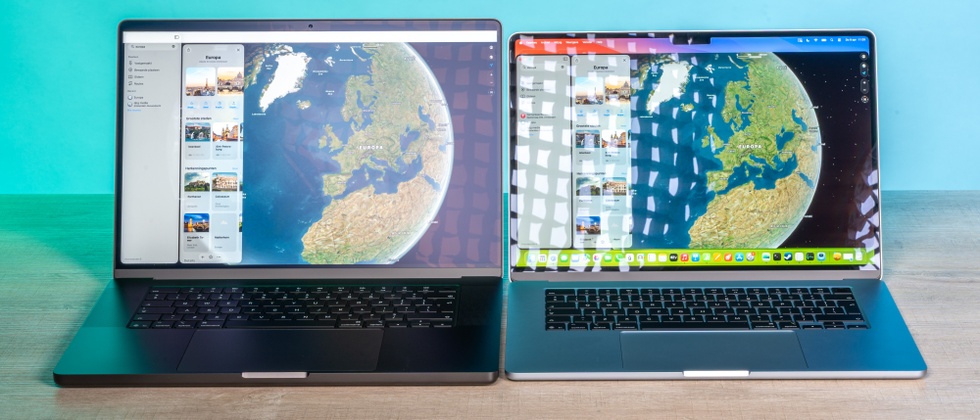 Het scherm van de MacBook Pro (2026) 16" (links) vergeleken met dat van de MacBook Air (2026) 15". Overdag valt vooral de optionele matte nanotextuuroptie van de MacBook Pro op, die ons testexemplaar heeft. Die verstrooit het omgevingslicht, zodat felle reflecties niet goed zichtbaar zijn. 's Avonds zijn de zwartwaarden van het minileddisplay in de MacBook Pro duidelijk beter dan die van het gewone ips-lcd in de Air. Wel zie je nog een klein beetje blooming van de miniledzones rondom objecten, waarvan een oleddisplay geen last zou hebben.