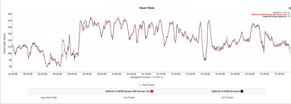 De GT Runner 2 gebruikt dezelfde optische hartslagmeter als de Watch GT 6. Mede geholpen door de lichte behuizing, die ervoor zorgt dat het horloge goed met de pols meebeweegt, is de nauwkeurigheid van de hartslagmeter goed tot zeer goed. In vergelijking met een Garmin fēnix 8 gekoppeld aan een Polar H10-borstband (de gouden standaard), waren de resultaten zeer consistent.