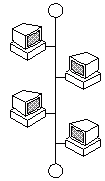 In dat geval (dus een verbinding met maximaal één hub) worden de computers verbonden zoals links te zien is. Rechts staat een afbeelding van de manier waarop de computers in geval van BNC verbonden worden. Zoals je wel zal begrijpen ligt hierbij het hele netwerk plat als één van de computers weg wordt gehaald of als één kabeltje kapot gaat. De kabel is dan namelijk onderbroken. Zorg er dus voor dat je in ieder geval een hub (en dus UTP) gebruikt als het netwerk uit meer dan twee computers bestaat.