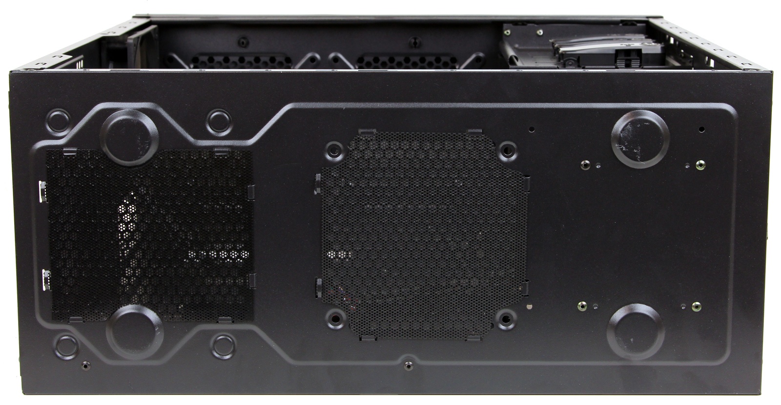 De onderkant bevat twee grote luchtroosters. Een daarvan is bedoeld als intake voor de voeding, terwijl achter het tweede rooster nog een extra ventilator kan worden geplaatst. Beide roosters zijn voorzien van een verwijderbaar stoffilter. De behuizing staat op vier pootjes, die in de bodemplaat zijn gestanst. Rubberen voetjes die hieronder kunnen worden geplakt, worden los meegeleverd.