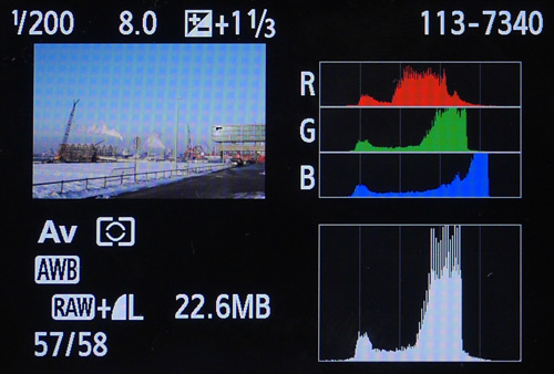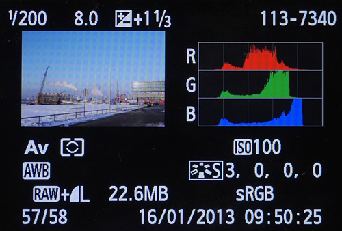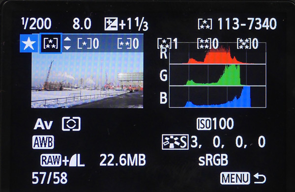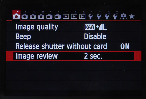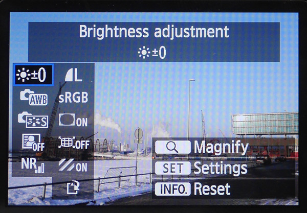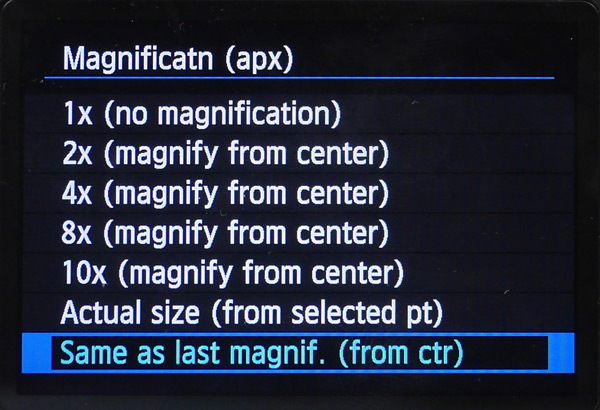 Bijzonder makkelijk vinden we de speciale inzoomknop aan de achterkant van de body. In het menu kan de zoomstand hiervoor ingesteld worden. De mogelijkheiden hiervoor zijn 1x, oftewel geen vergroting, 2x, 4x, 10x en pixel-voor-pixel. Er kan ook gekozen worden voor de laatst gebruikte vergroting. In tegenstelling tot bij bijvoorbeeld bij de EOS 60D kun je nu direct na het nemen van een foto inzoomen met deze knop en hoef je niet eerst de afspeelknop in te drukken. Van de ingezoomde stand naar volledig uitgezoomd gaat ook via deze zoomknop.