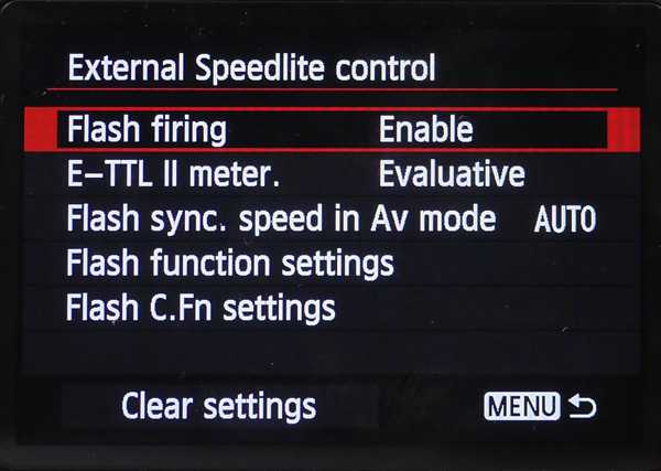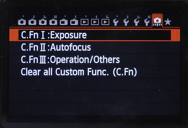 Het hoofdmenu is bij de EOS 6D onderverdeeld in vijftien tabbladen, waarvan zes voor het maken van foto's, drie voor de afspeelfunctionaliteit, vier om de overige instellingen in kwijt te kunnen, en eigen tabbladen voor de belangrijke C.Fn-functies en My Menu. Dit laatste tabblad is bedoeld om veelgebruikte functies snel te kunnen benaderen. De C.Fn-flitserinstellingen zijn slim ondergebracht in het External Speedlite Control-submenu.