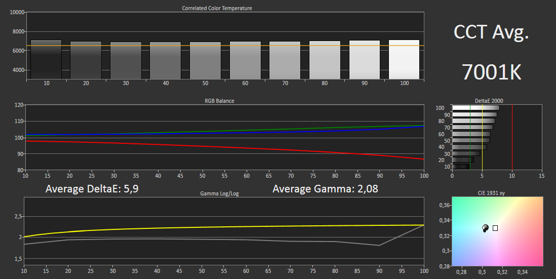 Dat betekent niet dat het een slecht scherm is, want dankzij de matte afwerking heb je vrijwel geen last van reflecties en het contrast is net zo hoog als bij de goedkopere uitvoering. De iets te hoge kleurtemperatuur, net te lage gammawaarde en iets te verzadigde kleuren zullen niet snel opvallen, maar helemaal strak gekalibreerd is het niet.