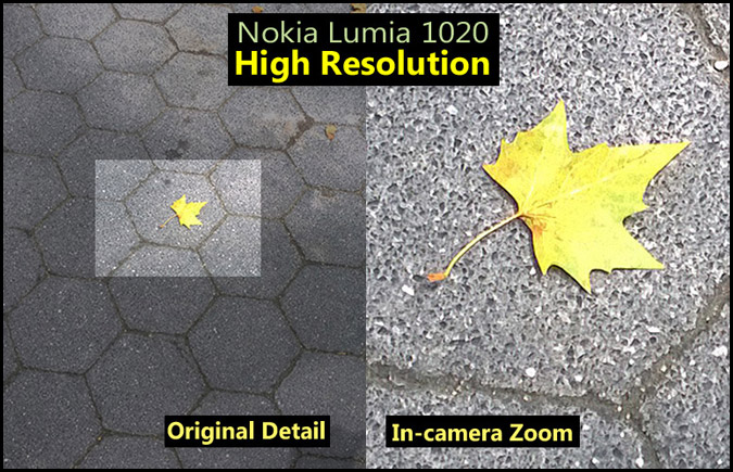 De Nokia Pureview 808 en Lumia 1020 zijn uitgerust met slechts een enkele lens, maar Nokia had wel iets bedacht om te kunnen 'zoomen'. De sensor heeft een resolutie van maar liefst 41 megapixel. Deze resolutie wordt echter standaard als bronmateriaal gebruikt om foto's van 5 megapixel uit te destilleren, zodat je kunt zoomen zonder zichtbaar kwaliteitsverlies. Dit heet oversampling en werkt best goed, waarbij de negatieve aspecten van digitale zoom beperkt blijven.