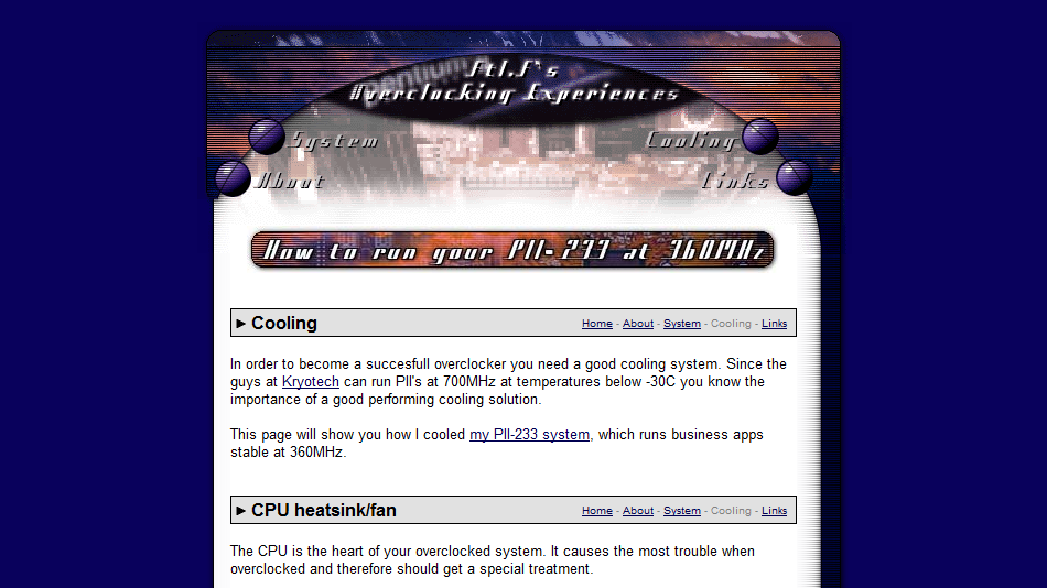 Dankzij een submit van een medestudent kreeg 'Ftl_F's Overclocking Experiences' een vermelding op Slashdot. Overklokken stond destijds nog in de kinderschoenen en een pagina waarop de basistechnieken van het overklokken werden uitgelegd, viel in de smaak bij het Slashdot-publiek. Zo beleefden we voor het eerst de sensatie van het Slashdot-effect. De site kreeg dankzij de vermelding op Slashdot maar liefst drieduizend bezoekers te verwerken. De trafficlimiet van ons shared-hostingaccount werd binnen een dag volgeserveerd, wat Femme deed besluiten om een dikker account te nemen met een hogere trafficlimiet en ondersteuning voor php, mSQL, MySQL en Perl. Hiermee kreeg hij de mogelijkheid om dynamische sites te bouwen. Tegenwoordig host je voor een paar euro per maand een WordPress-site, maar destijds moest er nog bijbetaald worden om scripts te kunnen draaien.