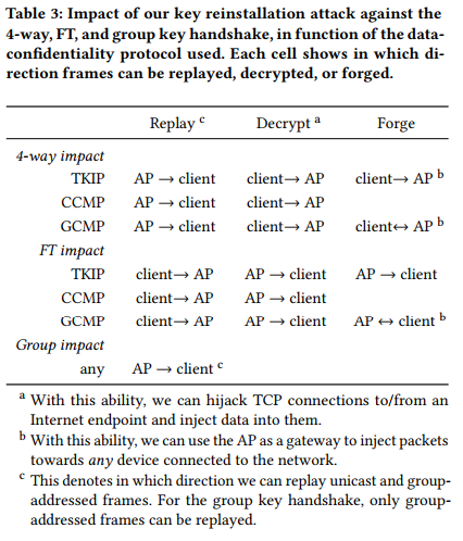 Normaal gesproken verstuurt de client dan een bericht dat dit is gebeurd. Als het toegangspunt dit bericht niet ontvangt, verstuurt hij het derde bericht opnieuw waarop de client dezelfde sleutel nog een keer installeert. Vanhoef maakt hiervan gebruik om zijn aanval uit te voeren, door het derde bericht op te vangen en steeds opnieuw te verzenden. Hierdoor installeert de client steeds de nieuwe sleutel en wordt het gebruikte pakketnummer steeds opnieuw gebruikt. Dit geeft de aanvaller vervolgens de mogelijkheid pakketten te ontsleutelen of te vervalsen.