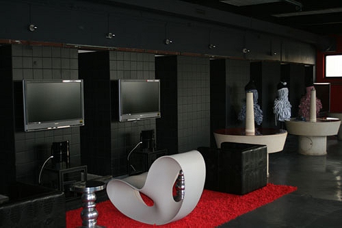 Boven is een douchezaal omgebouwd tot ontvangst- en testruimte. Een vijftal grote plasmaschermen, een beamer en een 71" lcd-scherm prijken hier. Opvallend is dat er enkel twee plasmaschermen en de beamer aanstaan.