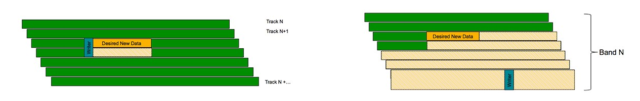 Voor leesacties heeft de toepassing van smr dus amper gevolgen en ook bij sequentiële schrijfbewerkingen is de impact verwaarloosbaar. De hoeveelheid data die moet worden herschreven, valt dan in het niet bij de totale schrijfactie. Bij kleine schrijfacties kan de invloed echter groot zijn. Als elke schrijfbewerking van een paar kilobytes het herschrijven van een heel blok data vereist, neemt de tijdsduur die nodig is om de actie te voltooien, in relatieve zin enorm toe. Vergelijk het met flashgeheugen in ssd's, waarbij per page kan worden gelezen, maar alleen per block geschreven.