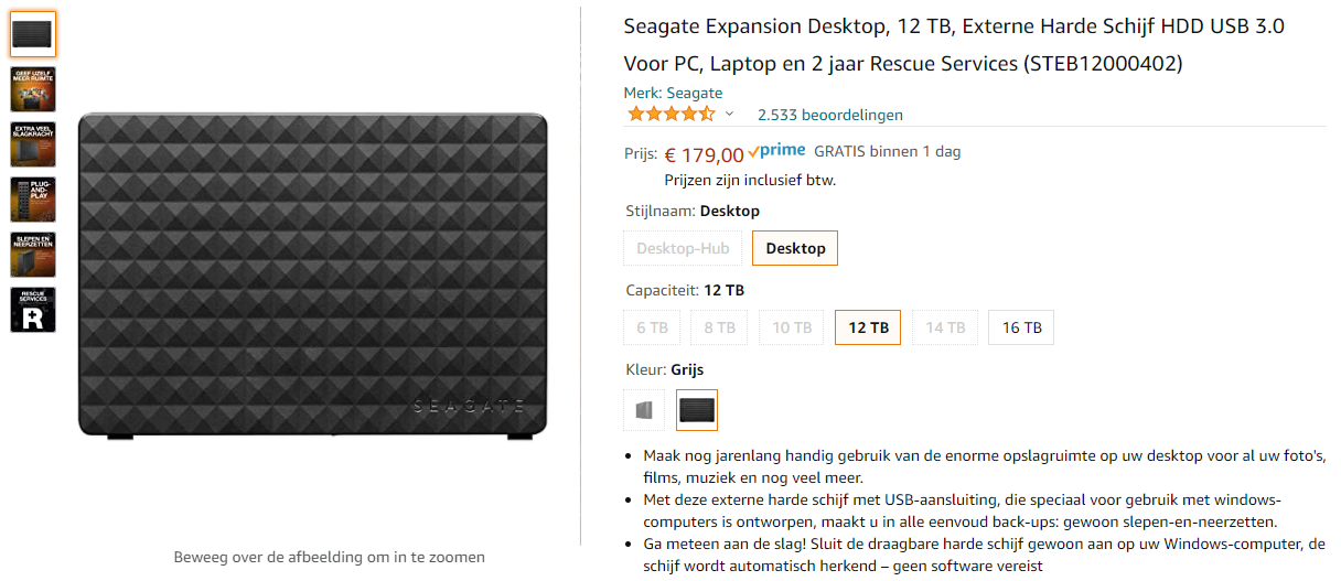 Na het nodige zoeken en vergelijken - net als bij laptops en koelkasten bestaan er soms winkelspecifieke uitvoeringen met afwijkende productcodes - kwamen we uit op de Seagate Expansion Desktop 12TB. Voor deze vrij rechttoe rechtaan ogende 3,5"-schijf betaalden we begin april 179 euro. Welke modellen waar in de aanbieding zijn, verschilt. Op het moment van schrijven kost de schijf alweer 196 euro, waarmee het overigens nog altijd de goedkoopste 12TB-disk is, en zijn andere modellen afgeprijsd.