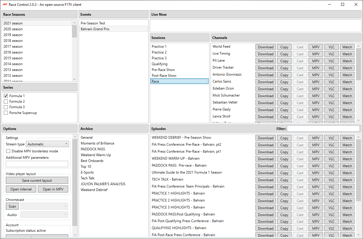 "Wat mij betreft is dat dat je je eigen lay-out kunt maken zoals je die zelf wilt hebben. Je slaat het op en de volgende keer staan alle streams met een druk op de knop weer precies waar je wilt. Ik zag weleens foto's voorbijkomen van een gebruiker die bijvoorbeeld drie schermen gebruikte en in totaal negen streams tegelijk had openstaan. Met de officiële site lukt dat niet. Het casten, en dus de Chromecast-ondersteuning, is ook een belangrijk element, maar dat kan inmiddels ook met de F1 TV-website. En dat je een robuuste mediaplayer hebt met een goede kwaliteit. Behalve voor VLC is er ook ondersteuning voor MPV, ook een opensourcemediaspeler met een goede kwaliteit."