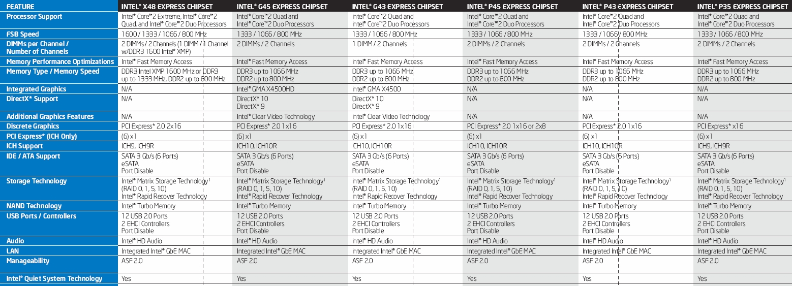 De P45 zal overigens de laatste chipset zijn die nog ddr2-geheugen ondersteunt, de volgende serie zal uitsluitend ddr3-ondersteuning bieden volgens Intel. De fabrikant introduceert naast de P45 nog een aantal varianten in zijn 4-serie, waaronder de G45 die over integrated graphics beschikt. Onderstaande tabel geeft de verschillen tussen de chipsets in de 4-lijn en de P35 weer.