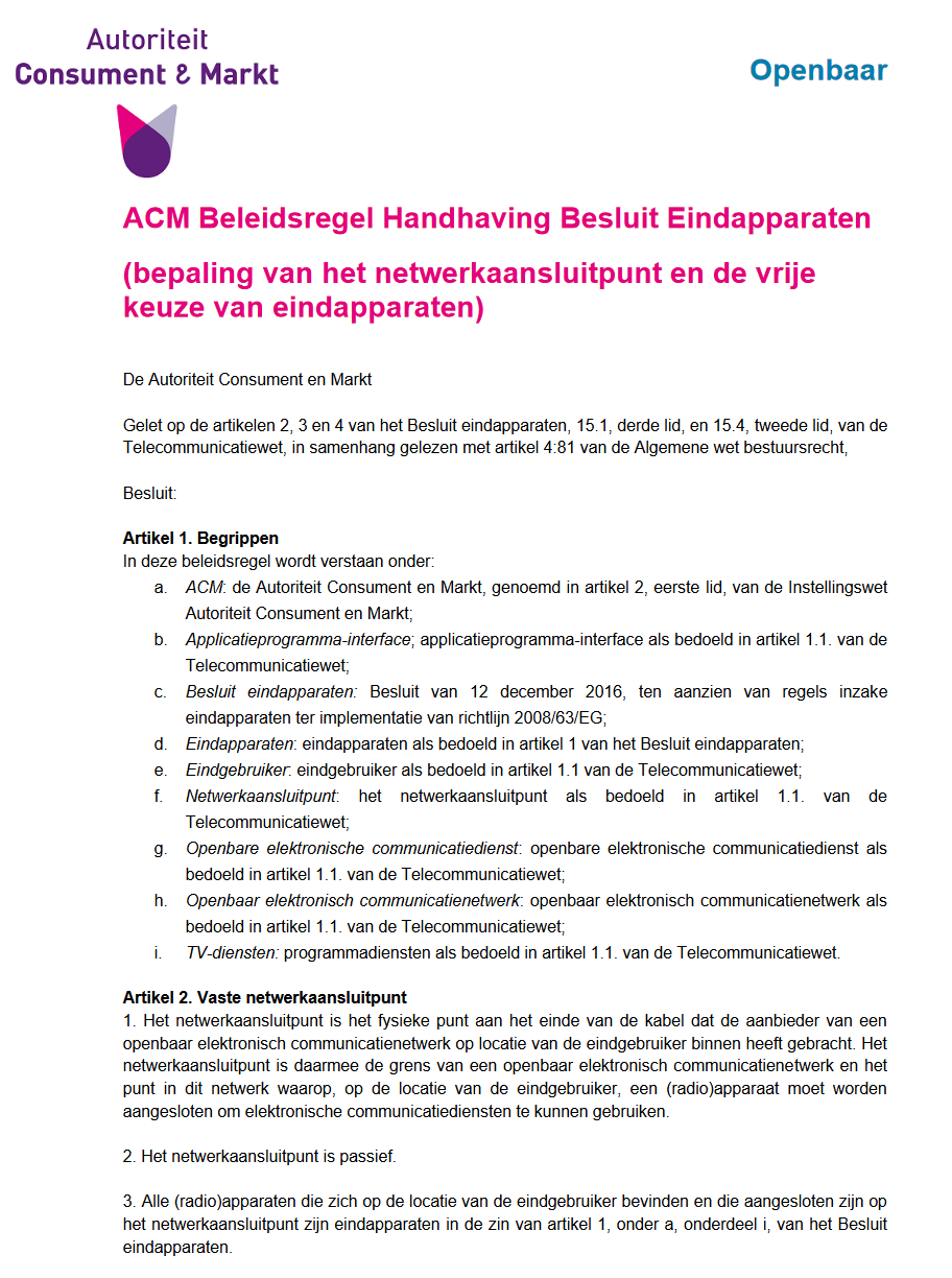 De beleidsregel Handhaving Besluit Eindapparaten werd afgelopen zomer gepubliceerd door de Autoriteit Consument en Markt. In de beleidsregel staat precies omschreven over welk deel van het netwerk de gebruiker vrije keuze heeft. Ook staat er in de regel welke informatie telecombeheerders moeten publiceren zodat consumenten weten welke routers en modems geschikt zijn voor het netwerk.
