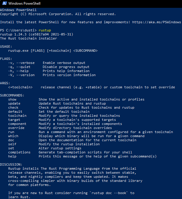 De installatie van rustup kan worden aangepast via een aantal opties die worden weergegeven in het geopende venster. Daarbij hebben wij gekozen voor de standaardinstallatie (1). Na de installatie van de toolchain-installer kan in powershell of command prompt het commando 'rustup' worden ingetypt en uitgevoerd om te verifiëren dat de installatie gelukt is.