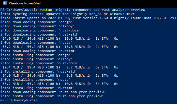 Om de installatie van ide-rust compleet te maken, moet nog de rust-analyser worden geïnstalleerd. Dit is een modulaire frontend voor Rust.