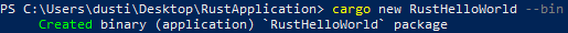 Een nieuw testproject 'Hello World' kan worden aangemaakt via Cargo. Cargo is de package manager van Rust en kan gebruikt worden voor het bouwen, draaien en beheren van Rust-projecten. Deze tool is standaard geïntegreerd in de toolchain-installer van Rust: rustup. Hiervoor is om deze reden geen extra installatie nodig. Het commando cargo new <project naam> --bin