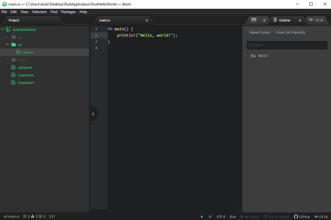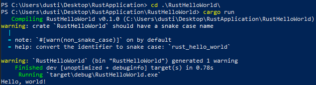 Nadat je naar de projectfolder bent genavigeerd via cd RustHelloWorld