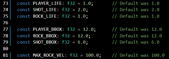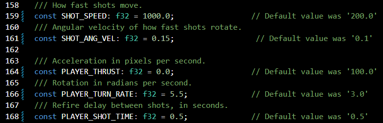 De snelheden van de speler, kogels en objecten kunnen eveneens aangepast worden. Deze kunnen worden aangepast op regels 159 tot en met 168.