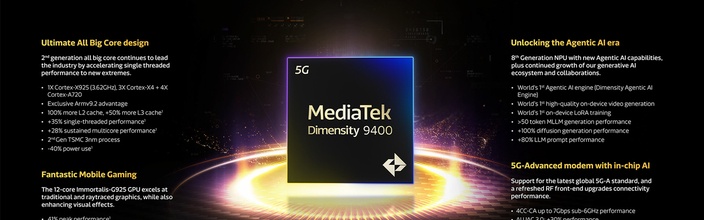 Nieuws - MediaTek komt met Dimensity 8400-soc met 'all big core'-ontwerp MediaTek heeft de Dimensity 8400 aangekondigd. Het betreft een mobiele octacorechip met enkel Arm Cortex-A725-prestatierekenkernen. De soc heeft een verbeterde zevenkernige Mali-gpu meegekregen en een verbeterde npu voor AI-taken. |
