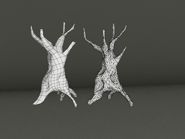 Alleen om ervoor te zorgen dat de game rond de 60 fps kan draaien met meerdere bomen, moeten ze wat 'detail' weghalen (linker boom). Je ziet dit ook vaak bij de modellen van de personages.